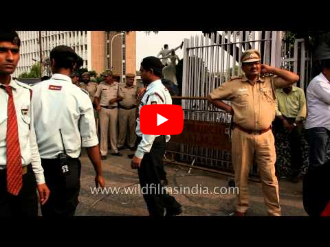 Keywords: police, guarding, aiims, hospital, gate, protesters, gather, numbers